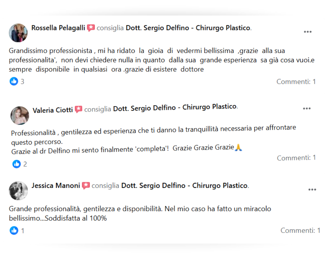 Mi sono rivolta al dott. Delfino sotto consiglio di una mia amica che ha fatto l'operazione di mastoplastica additiva anni fa' e si è trovata molto bene.